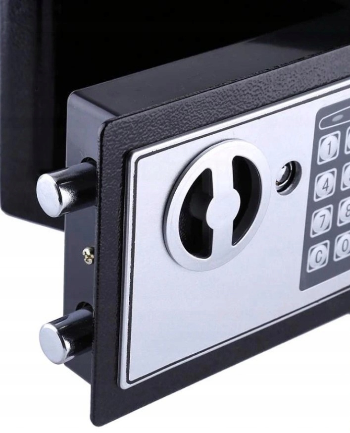 Надійна робота та можливість налаштувати власний шифр надають вам впевненості та безпеки та гарантують, що ніхто, крім нас, не матиме доступу до вмісту. Сейф міцний і стійкий до пошкоджень, відносно важкий. Таким чином, знижується ризик викрадення всього тайника і винесення його непоміченим за межі об'єкта або приміщення, в якому він знаходиться. Закриття дверей товстими засувами ефективно виконує додаткову захисну роль, запобігаючи їх зриву. Сейф забезпечує можливість зберігати всі важливі речі, в т.ч гроші, коштовності, документи або невелике електронне обладнання, а також носії інформації з конфіденційними даними. Розміри простору всередині сейфа дозволяють вмістити аркуші до формату А5 і всілякі дрібні предмети великої вартості. Дно сейфа можна вистелити тканинною прокладкою, яка входить у комплект . Він захистить прикраси або інші цінні речі від випадкового пошкодження або подряпин. На передній частині дверей є електронна панель управління . Живиться від 4 батарейок АА, розташованих на внутрішній стінці дверцят. Ми також маємо доступ до традиційного замка з ключем . Дозволяє екстрено відкривати сейфу разі забуття коду. Тому ключ слід тримати подалі від сейфа, щоб запобігти несанкціонованому доступу. На дверцятах є ручка, за допомогою якої відкриваються дверцята сейфа . Сигнальні діоди , розташовані над панеллю, інформують про стан батареї, а також про те, чи правильно ми виконуємо дії. При необхідності заміни батареї світлодіод засвітиться після відкриття сейфа. За допомогою панелі ви можете встановити та змінити персональний код доступу. Якщо пароль доступу буде введено неправильно 3 рази, пролунає сигнал і клавіатура буде заблокована на 30 секунд. Якщо тричі ввести неправильний пароль доступу, пристрій буде заблоковано на 5 хвилин.