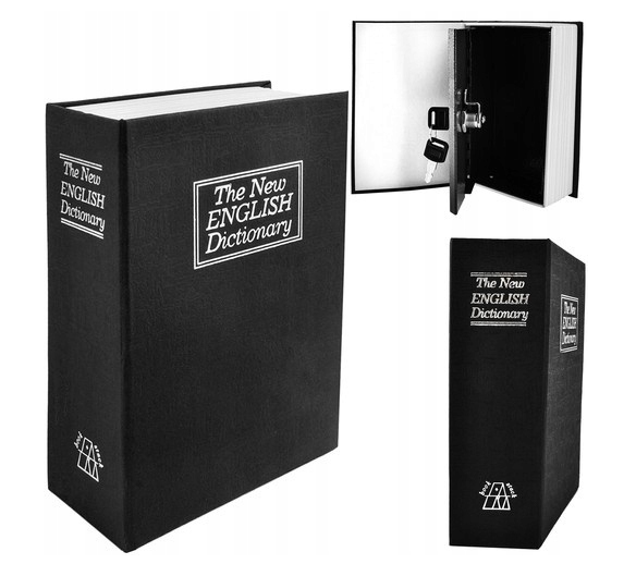 - СПЕЦИФІКАЦІЯ - матеріал; нержавіюча сталь, прихована в книзі домінуючий матеріал: папір, інші: ABS; колір: чорний/білий; зовнішні розміри (довжина/ширина/висота) 18/11,5/5,6 см; внутрішні розміри 16,8/10/5 см; вага: 415 г; вага в упаковці: 439г.